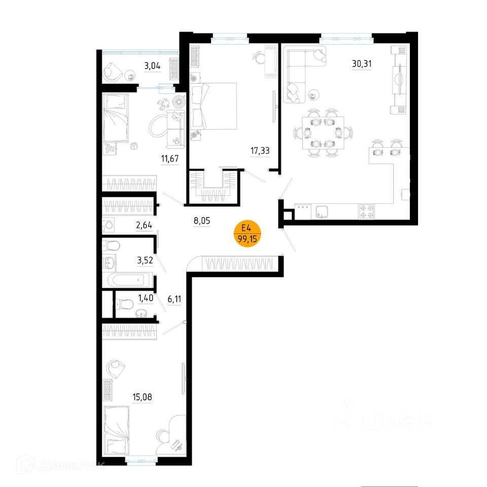 3 комн. квартира в ЖК Смарт Квартал ЦЕНТРАЛЬНЫЙ, площадь 99.15 м², жилая 44.08 м², кухня 30.31 м²