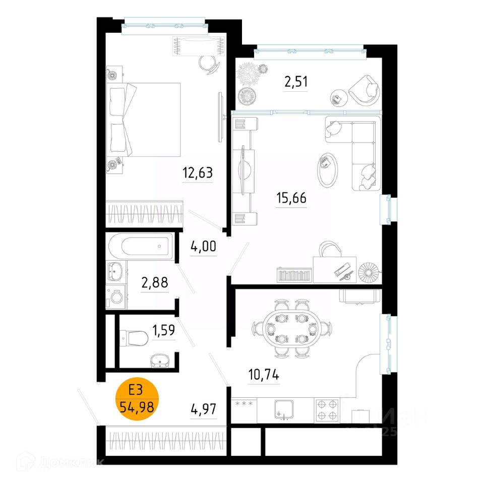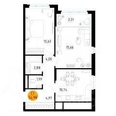2 комн. квартира в ЖК Смарт Квартал ЦЕНТРАЛЬНЫЙ, площадь 54.98 м², жилая 28.29 м², кухня 13.25 м²