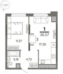 1 комн. квартира в ЖК "Северный", площадь 36.57 м², жилая 11.37 м², кухня 17.3 м²