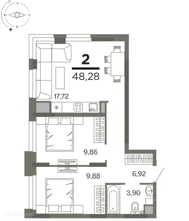 2 комн. квартира в ЖК "Северный", площадь 48.28 м², жилая 19.74 м², кухня 17.72 м²