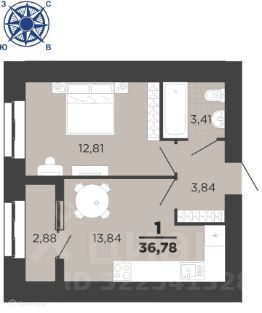 1 комн. квартира в ЖК "Юный", площадь 36.78 м², жилая 12.81 м², кухня 13.84 м²