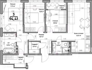 3 комн. квартира в ЖК Аструм, площадь 94.41 м², жилая 40.33 м², кухня 23.31 м²