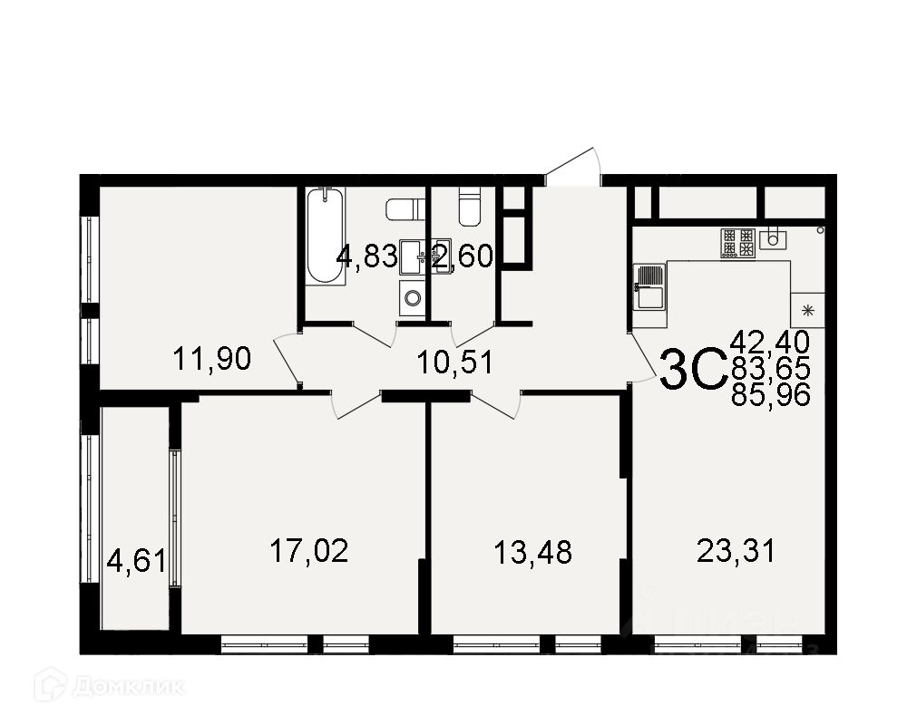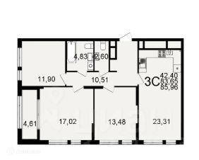 3 комн. квартира в ЖК "Открытие", площадь 85.96 м², жилая 42.4 м², кухня 23.31 м²