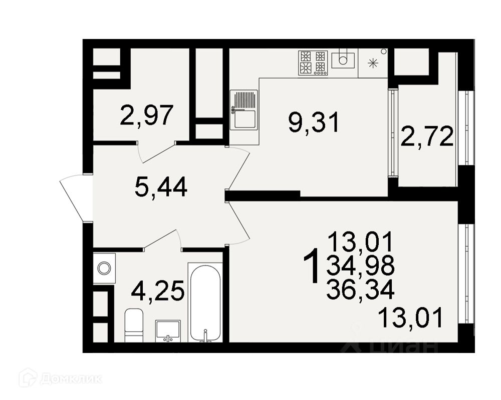 1 комн. квартира в ЖК "Открытие", площадь 36.34 м², жилая 13.01 м², кухня 9.31 м²