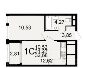 1 комн. квартира в ЖК "Открытие", площадь 32.68 м², жилая 10.53 м², кухня 12.62 м²