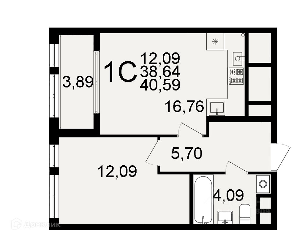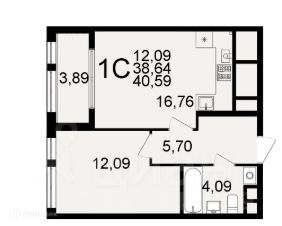1 комн. квартира в ЖК "Открытие", площадь 40.59 м², жилая 12.09 м², кухня 16.76 м²