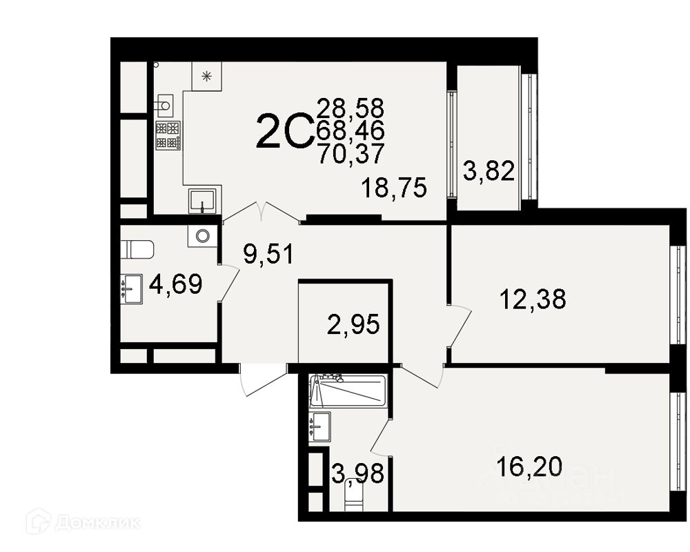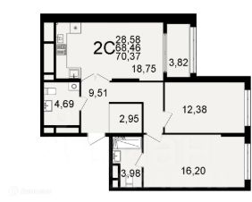 2 комн. квартира в ЖК "Открытие", площадь 70.37 м², жилая 28.58 м², кухня 18.75 м²