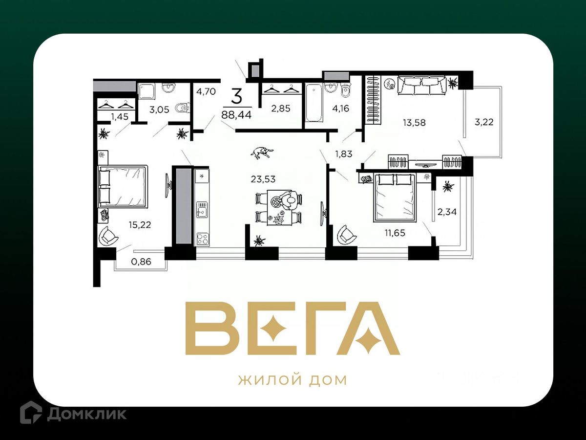 3 комн. квартира в ЖК ВЕГА, площадь 88.44 м², жилая 40.45 м², кухня 23.53 м²