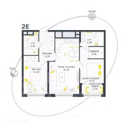 2 комн. квартира в ЖК Космос, площадь 64.69 м², жилая м², кухня м²