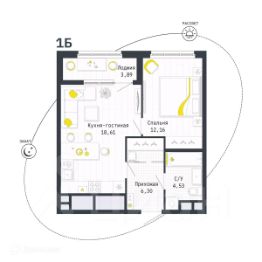 1 комн. квартира в ЖК Космос, площадь 43.55 м², жилая м², кухня м²