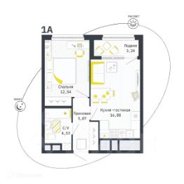 1 комн. квартира в ЖК Космос, площадь 40.64 м², жилая м², кухня м²