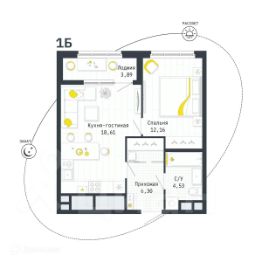 1 комн. квартира в ЖК Космос, площадь 43.55 м², жилая м², кухня м²