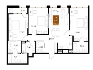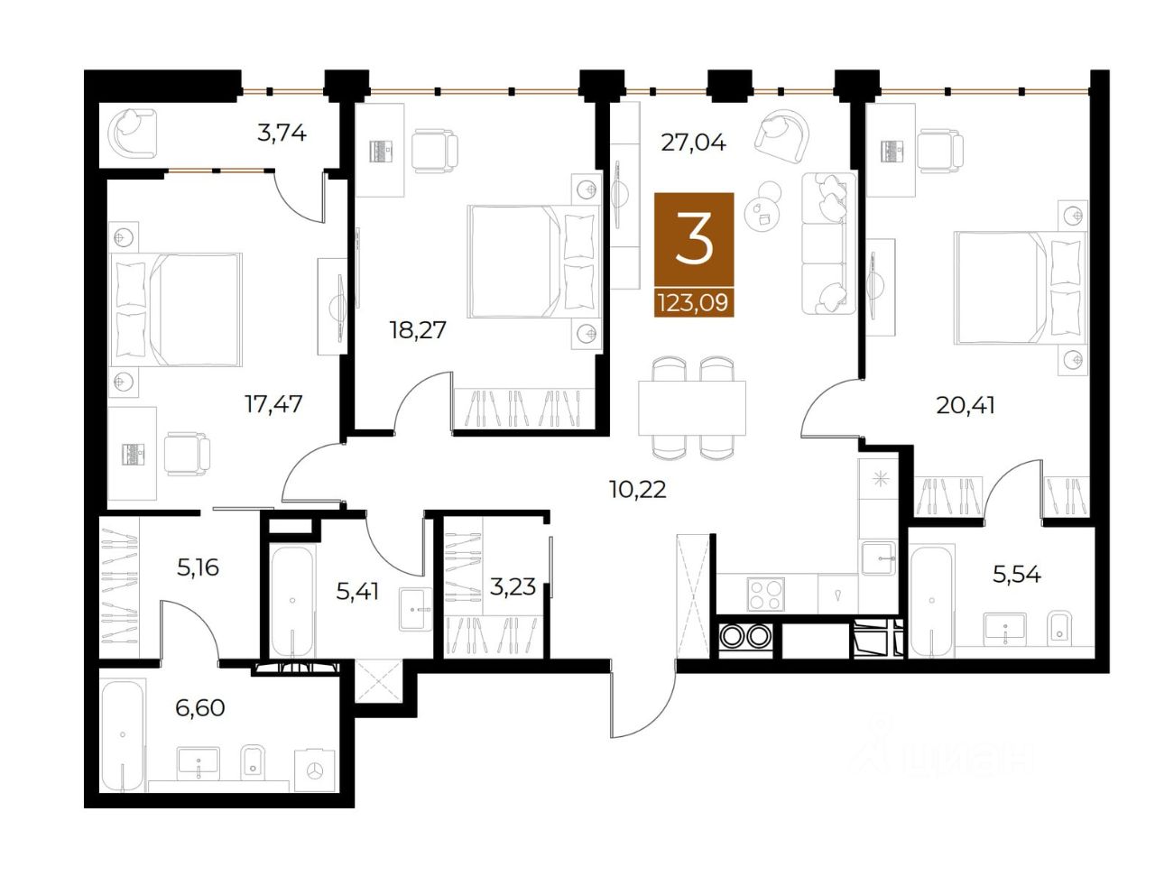 3 комн. квартира в ЖК МЕДНЫЙ, площадь 123.09 м², жилая 56.15 м², кухня 27.04 м²