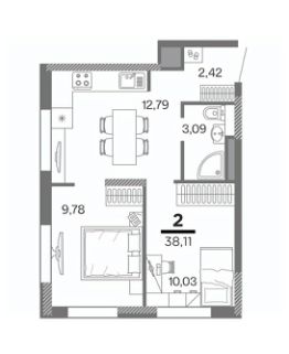 2 комн. квартира в ЖК Метропарк 4, площадь 38.11 м², жилая 19.81 м², кухня 12.79 м²