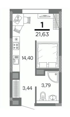 1 комн. квартира в ЖК Метропарк 4, площадь 21.63 м², жилая 14.4 м², кухня м²