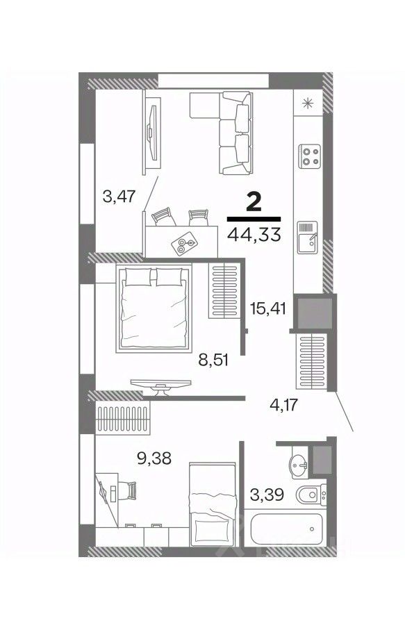 2 комн. квартира в ЖК Метропарк 4, площадь 44.33 м², жилая 17.89 м², кухня 15.41 м²
