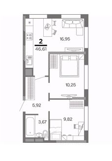 2 комн. квартира в ЖК Метропарк 4, площадь 46.61 м², жилая 20.07 м², кухня 16.95 м²