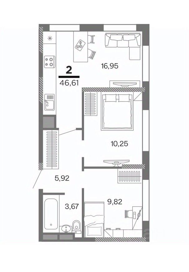 2 комн. квартира в ЖК Метропарк 4, площадь 46.61 м², жилая 20.07 м², кухня 16.95 м²