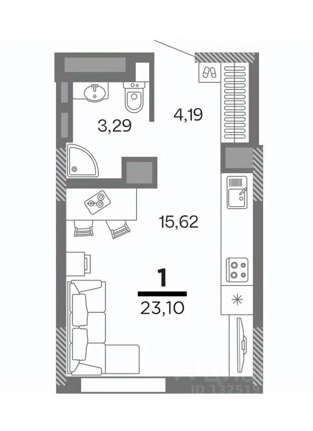1 комн. квартира в ЖК Метропарк 4, площадь 23.1 м², жилая 15.62 м², кухня м²