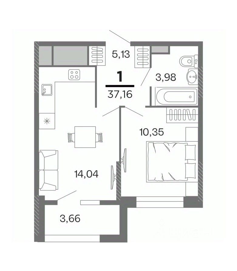 2 комн. квартира в ЖК Метропарк 4, площадь 37.16 м², жилая 20.48 м², кухня 11.15 м²