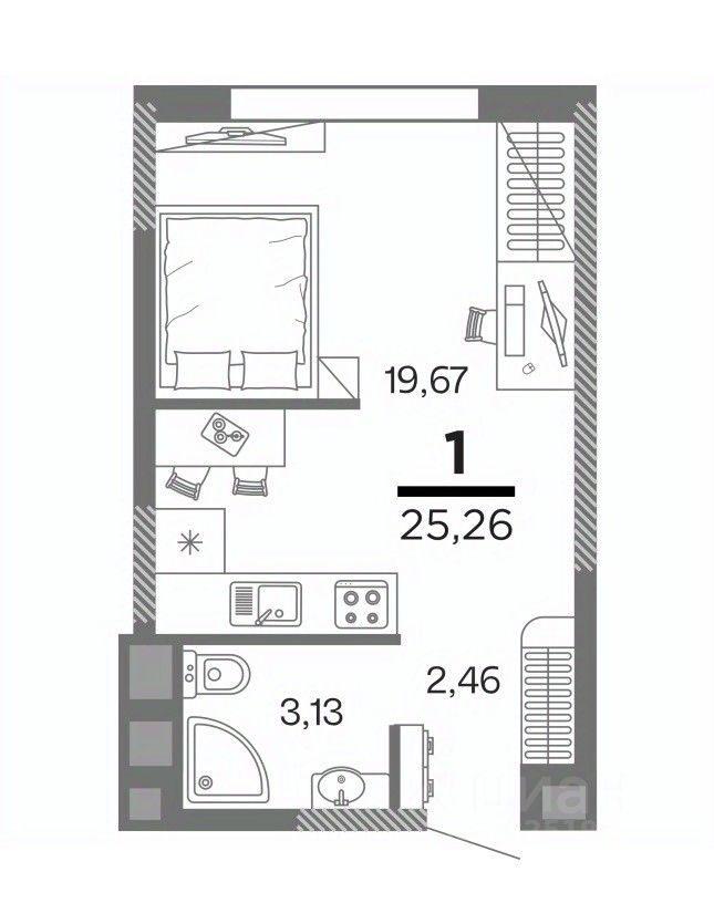1 комн. квартира в ЖК Метропарк 4, площадь 25.26 м², жилая 19.67 м², кухня м²