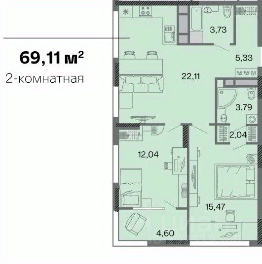 2 комн. квартира в ЖК Дом по Московское шоссе, площадь 69.11 м², жилая 27.51 м², кухня 22.11 м²