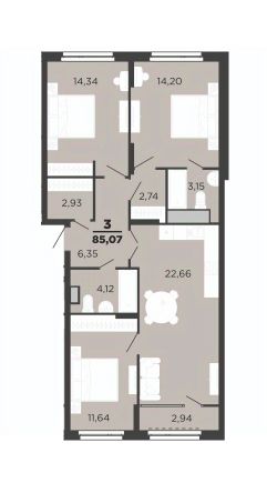3 комн. квартира в ЖК Метропарк, площадь 85.07 м², жилая 40.18 м², кухня 22.66 м²