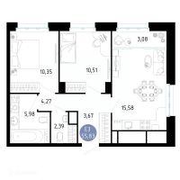 2 комн. квартира в ЖК РОЩА, площадь 55.83 м², жилая 20.86 м², кухня 18.66 м²