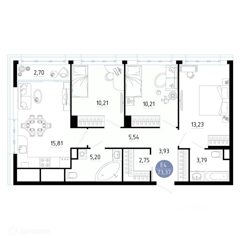 3 комн. квартира в ЖК РОЩА, площадь 73.37 м², жилая 33.65 м², кухня 18.82 м²