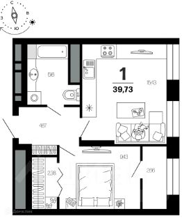 1 комн. квартира в ЖК Тринити, площадь 39.73 м², жилая 9.43 м², кухня 15.43 м²