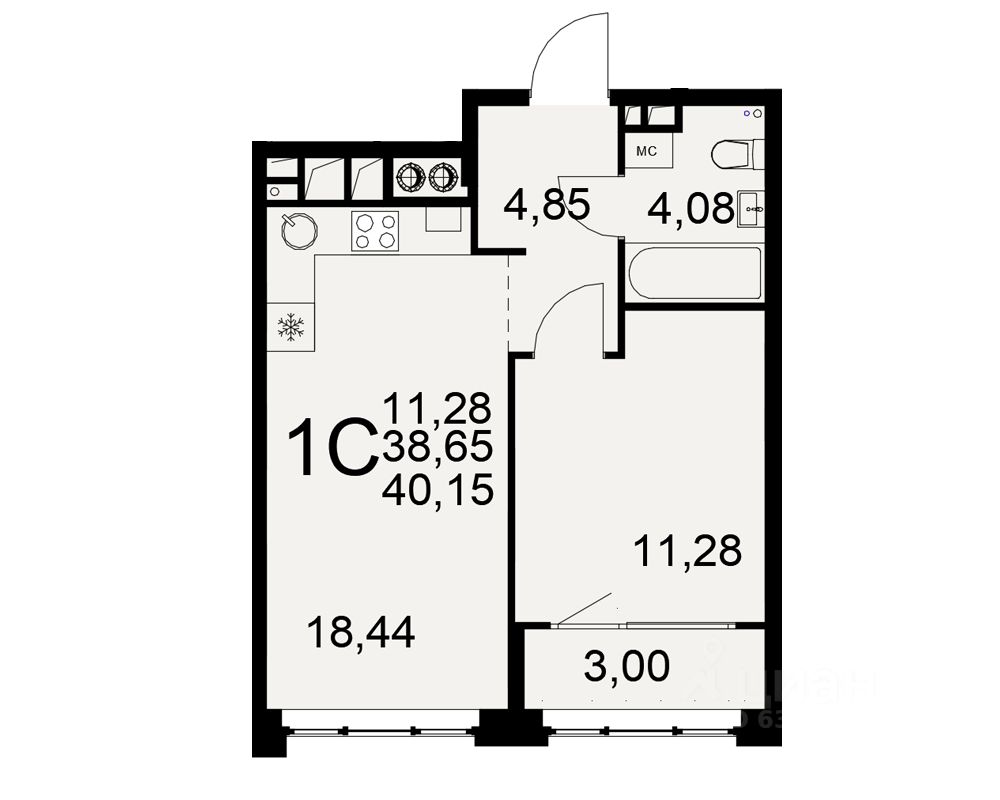 Общая площадь38,65 м²