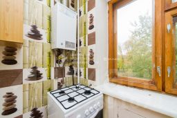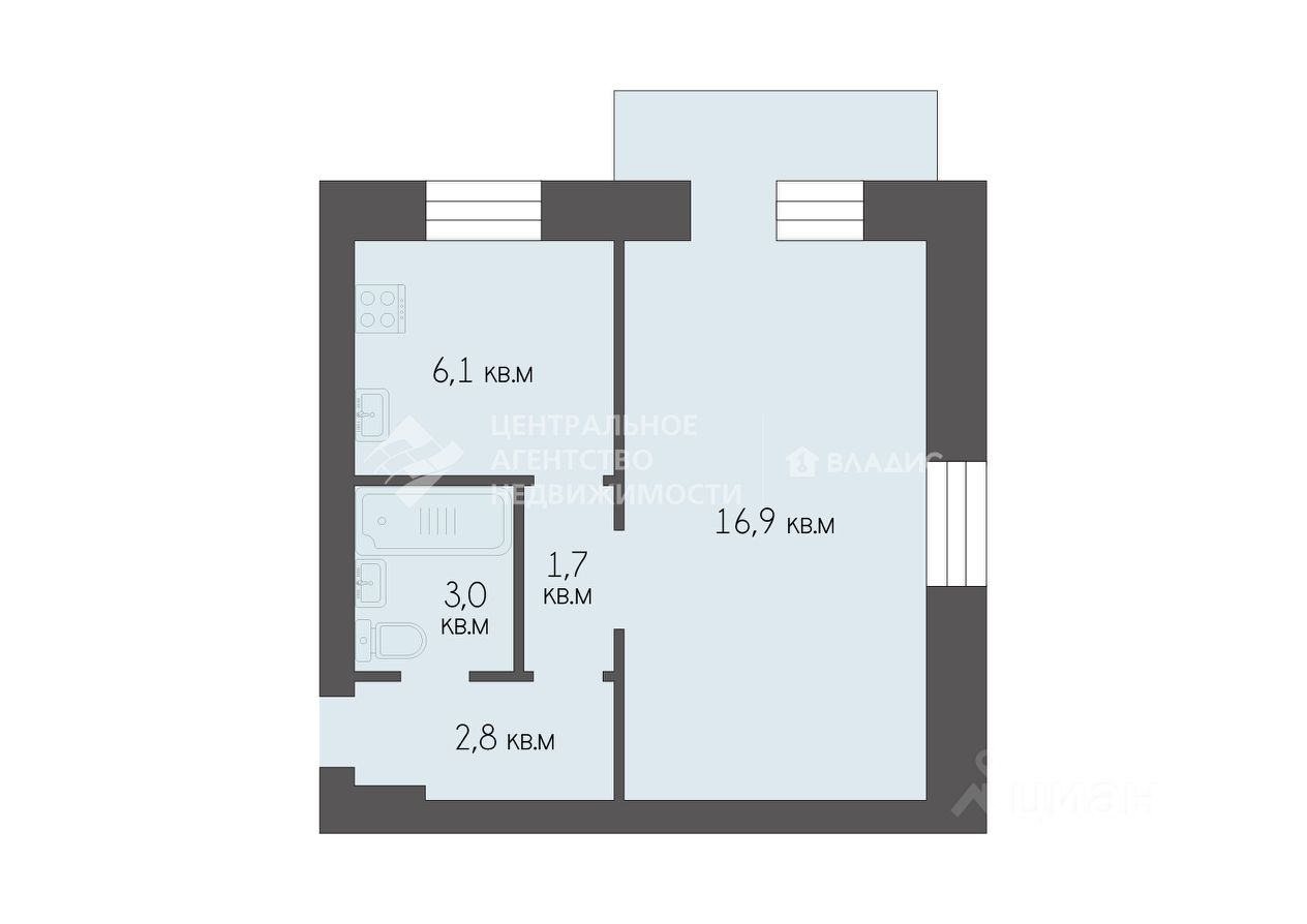 Общая площадь квартиры составляет 30,5 кв. м, жилая — 16,9 кв. м, площадь кухни — 6,1 кв. м. Окна выходят на зеленый двор. Есть балкон. Совмещённый санузел.