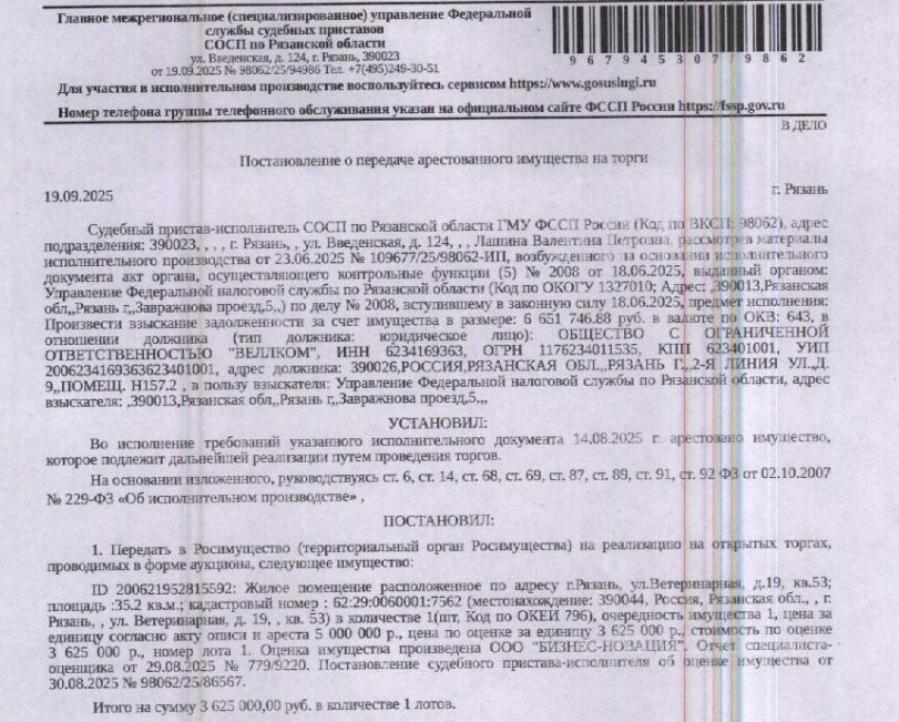 Помещение, назначение: жилое, площадь 35,2 кв.м., кадастровый номер 62:29:0060001:7562, адрес: Российская Федерация, Рязанская область, городской округ город Рязань, город Рязань, Ветеринарная улица, дом 19, квартира 53. Сведениями о зарегистрированных по данному адресу лицах, а также о задолженности по взносам на капитальный ремонт Организатор торгов не располагает. Залогодержатель: УФНС по Рязанской области. Начальная цена: 3 625 000 (Три миллиона шестьсот двадцать пять тысяч) руб. 00 коп., без НДС. Задаток: 180 000 (Сто восемьдесят тысяч) руб. 00 коп. Шаг аукциона 1%: 36 250 (Тридцать шесть тысяч двести пятьдесят) руб. 00 коп.
