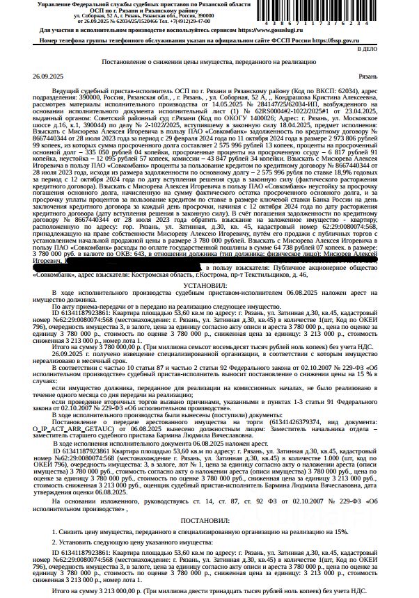 Помещение, назначение: жилое, наименование: квартира, площадь 53,6 кв.м, кадастровый номер 62:29:0080074:568, местоположение: Рязанская область, г. Рязань, ул. Затинная, д. 30, кв. 45. Согласно справке ООО "Р-Энергия" от 11.08.2025 г. по данному адресу зарегистрированных лиц нет, задолженность по взносам на капитальный ремонт составляет 24 819,20 руб. Залогодержатель: ПАО "Совкомбанк". Начальная цена: 3 213 000 (Три миллиона двести тринадцать тысяч) руб. 00 коп., без НДС. Задаток: 150 000 (Сто пятьдесят тысяч) руб. 00 коп.; Шаг аукциона 1%: 32 130 (Тридцать две тысячи сто тридцать) руб. 00 коп.