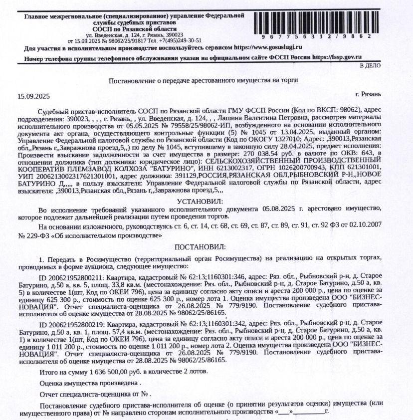 Помещение, назначение: жилое, наименование: квартира, кадастровый номер 62:13:1160301:342, этаж 1, площадь 57,4 кв м, местоположение: Рязанская область, р-н Рыбновский, д Старое Батурино, д 50а, кв 1. Согласно акту о наложении ареста (описи имущества) от 05.08.2025 квартира в аварийном состоянии, не пригодна для проживания. Сведениями о зарегистрированных по данному адресу лицах, а также о задолженности по взносам на капитальный ремонт Организатор торгов не располагает. Взыскатель: УФНС России по Рязанской области. Начальная цена: 1 011 200 (Один миллион одиннадцать тысяч двести) руб. 00 коп., без НДС. Задаток: 500 000 (Пятьсот тысяч) руб. 00 коп. Шаг аукциона 1%: 10 112 (Десять тысяч сто двенадцать) руб. 00 коп.