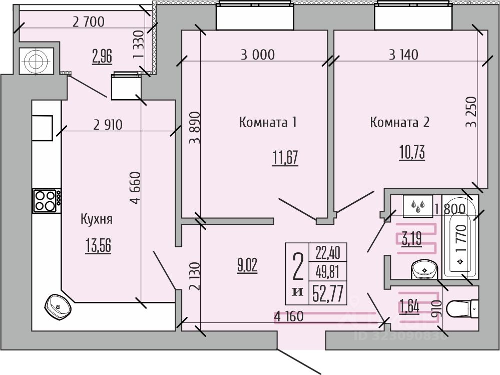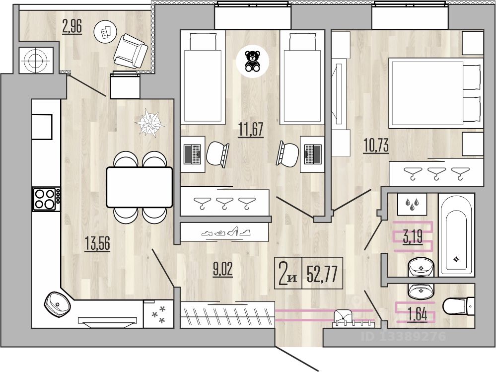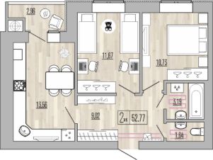 Двухкомнатная квартира европланировки площадью 52,77 кв.м Вместительная кухня-гостиная и две комфортабельные комнаты.