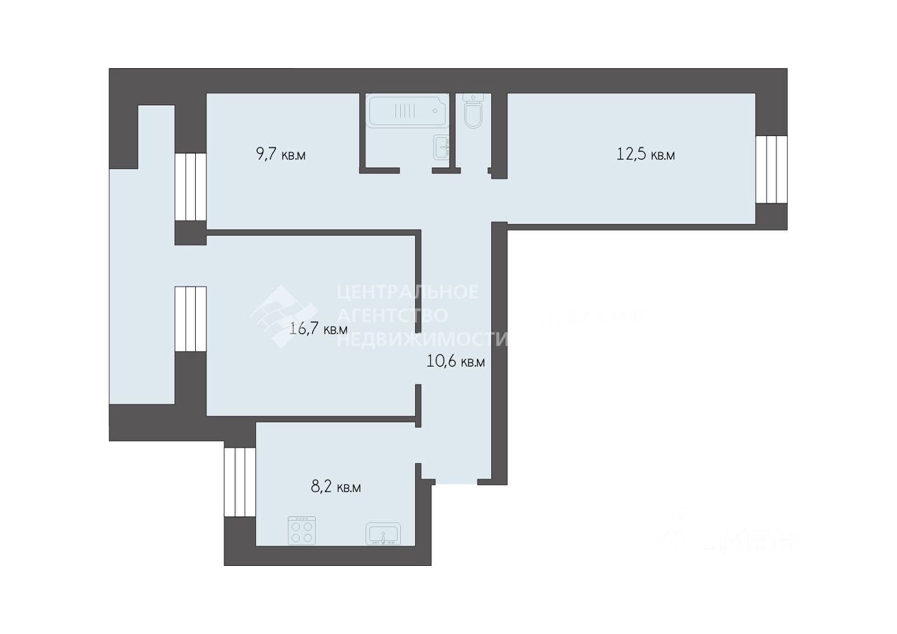 Три изолированные комнаты (16,7 + 9,7 + 12,5 кв. м) позволяют организовать пространство по своему вкусу и потребностям.