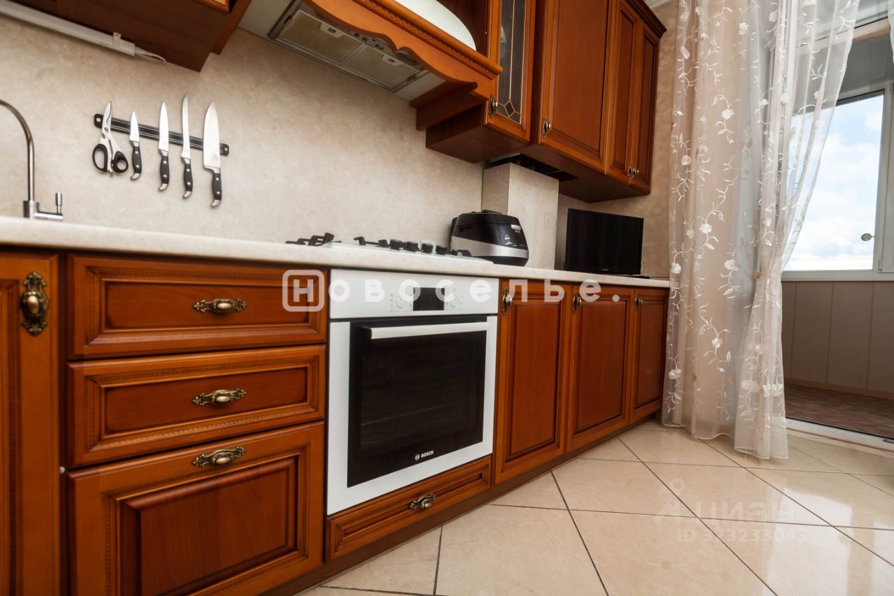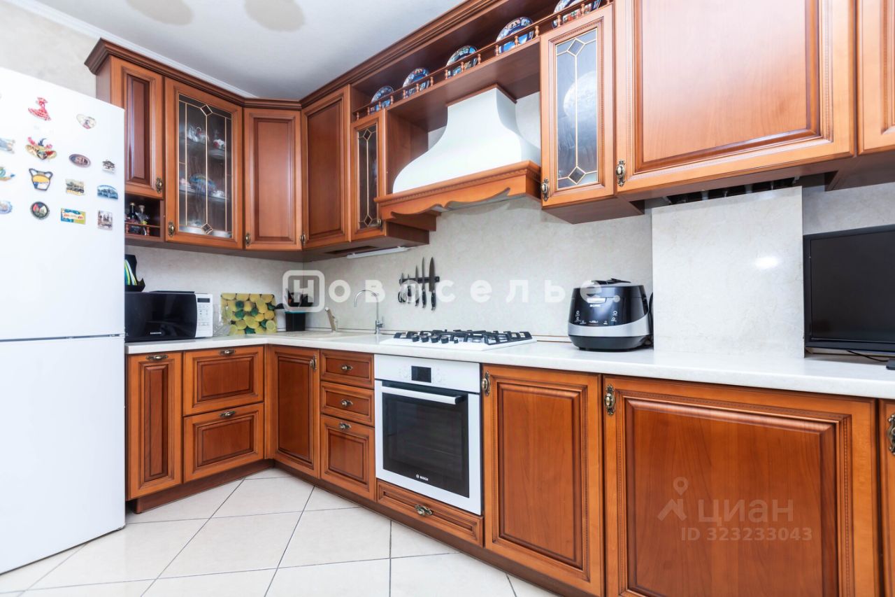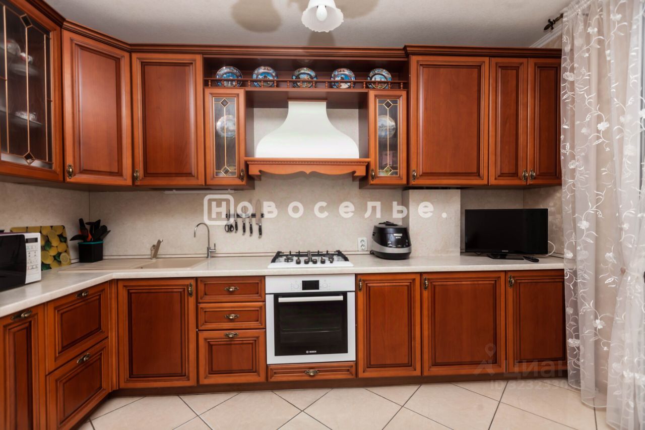 Кухня оборудована встроенной мебелью из массива ценных пород дерева