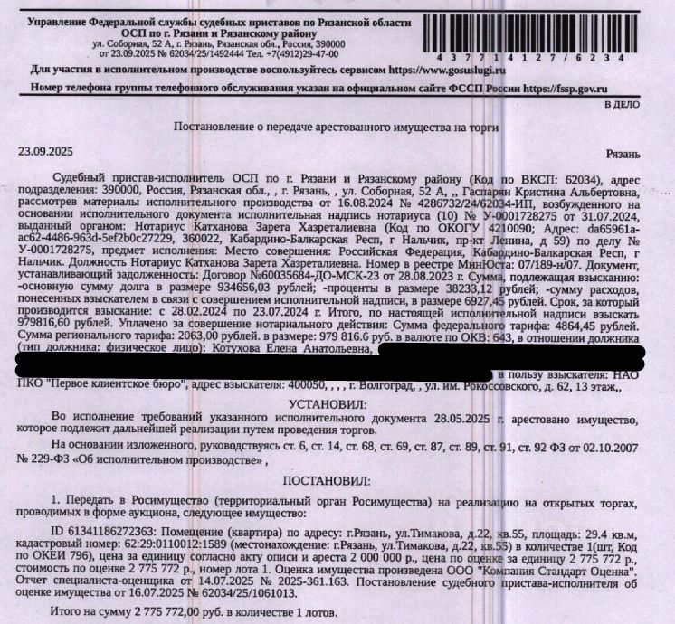 Помещение, назначение: жилое, наименование: квартира, кадастровый номер 62:29:0110012:1589, этаж 3, площадь 29,4 кв.м, местоположение: г. Рязань, ул. Тимакова, д. 22, кв. 55. Согласно справке ООО "Р-Энергия" от 25.09.2025 г. по данному адресу зарегистрированных лиц нет, задолженность по взносам на капитальный ремонт составляет 16784,18 руб. Взыскатель: НАО ПКО "Первое клиентское бюро". Начальная цена: 2 775 772 (Два миллиона семьсот семьдесят пять тысяч семьсот семьдесят два) руб. 00 коп., без НДС, сумма задатка: 1 350 000 (Один миллион триста пятьдесят тысяч) руб. 00 коп. Шаг аукциона 1%: 27 757 (Двадцать семь тысяч семьсот пятьдесят семь) руб. 72 коп.