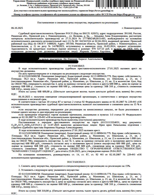 Помещение, назначение: жилое, наименование: квартира, площадь 56,3 кв.м, кадастровый номер 62:11:0090416:779, местоположение: Рязанская обл., Пронский р-н, д. Мамоново, ул. Школьная, 21, кв.2. Согласно справке ООО "Р-Энергия" от 25.07.2025 г. по данному адресу зарегистрирован 1 человек. Сведениями о задолженности по взносам на капитальный ремонт Организатор торгов не располагает. Взыскатель: ИП Инюшин К.А. Начальная цена: 568 310 (Пятьсот шестьдесят восемь тысяч триста десять) руб. 00 коп., без НДС. Задаток: 280 000 (Двести восемьдесят тысяч) руб. 00 коп. Шаг аукциона 1%: 5 683 (Пять тысяч шестьсот восемьдесят три) руб. 10 коп.