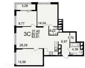 3 комн. квартира в ЖК Большая история, площадь 82.61 м², жилая 37.4 м², кухня 28.29 м²
