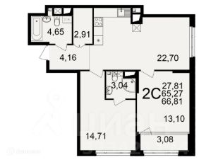 2 комн. квартира в ЖК Большая история, площадь 66.81 м², жилая 27.81 м², кухня 22.7 м²