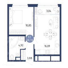 1 комн. квартира в ЖК Бульвар оптимистов, площадь 38.78 м², жилая 10.85 м², кухня 19.13 м²