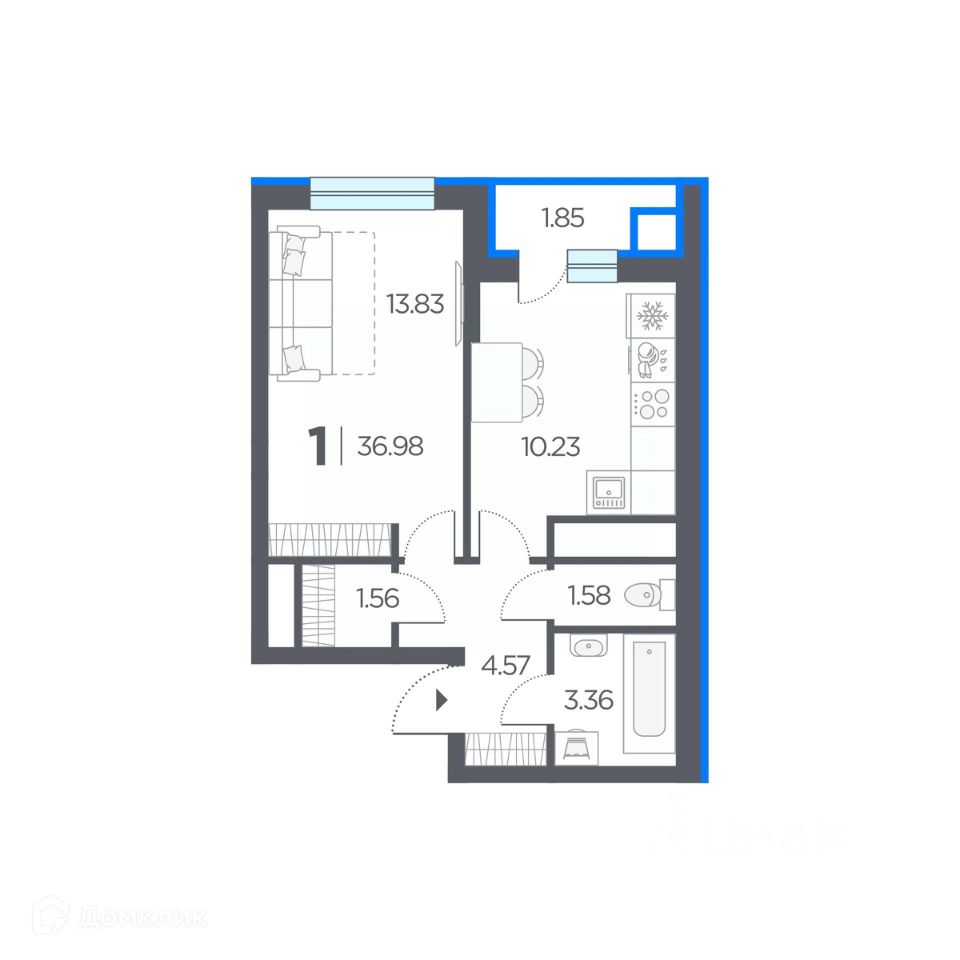 1 комн. квартира в ЖК Новые горизонты, площадь 36.98 м², жилая 13.83 м², кухня 10.23 м²