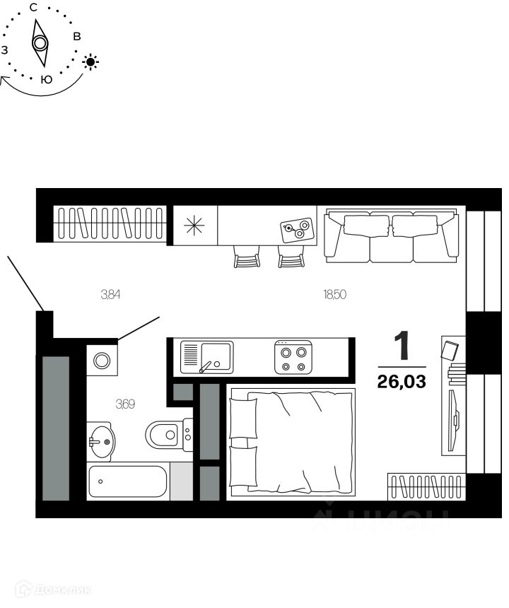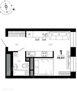 1 комн. квартира в ЖК Тринити, площадь 26.03 м², жилая 18.5 м², кухня м²