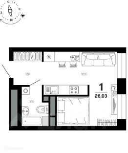 1 комн. квартира в ЖК Тринити, площадь 26.03 м², жилая 18.5 м², кухня м²