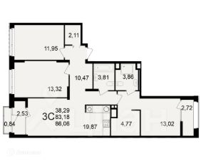 3 комн. квартира в ЖК Аура, площадь 86.06 м², жилая 38.29 м², кухня 19.87 м²