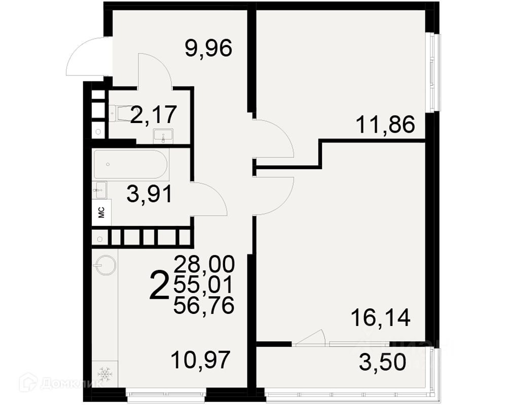 2 комн. квартира в ЖК Радости жизни, площадь 56.76 м², жилая 28 м², кухня 10.97 м²