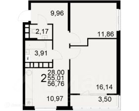2 комн. квартира в ЖК Радости жизни, площадь 56.76 м², жилая 28 м², кухня 10.97 м²