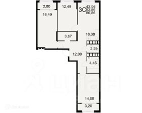 3 комн. квартира в ЖК Радости жизни, площадь 86.86 м², жилая 43.06 м², кухня 18.38 м²